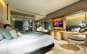Équipements : Matelas en mousse à mémoire de forme - TV à écran plat 55" – Terrasse – Minibar - Évier double - Peignoir et chaussons - Boîte de sécurité électronique - Fer à repasser à vapeur - Services de thé et de café - Cafetière Nespresso - Sèche-cheveux - Service de majordome – Wifi - Rideaux opaques - Menu de l'oreiller - Service de découvert - Service en chambre 24h